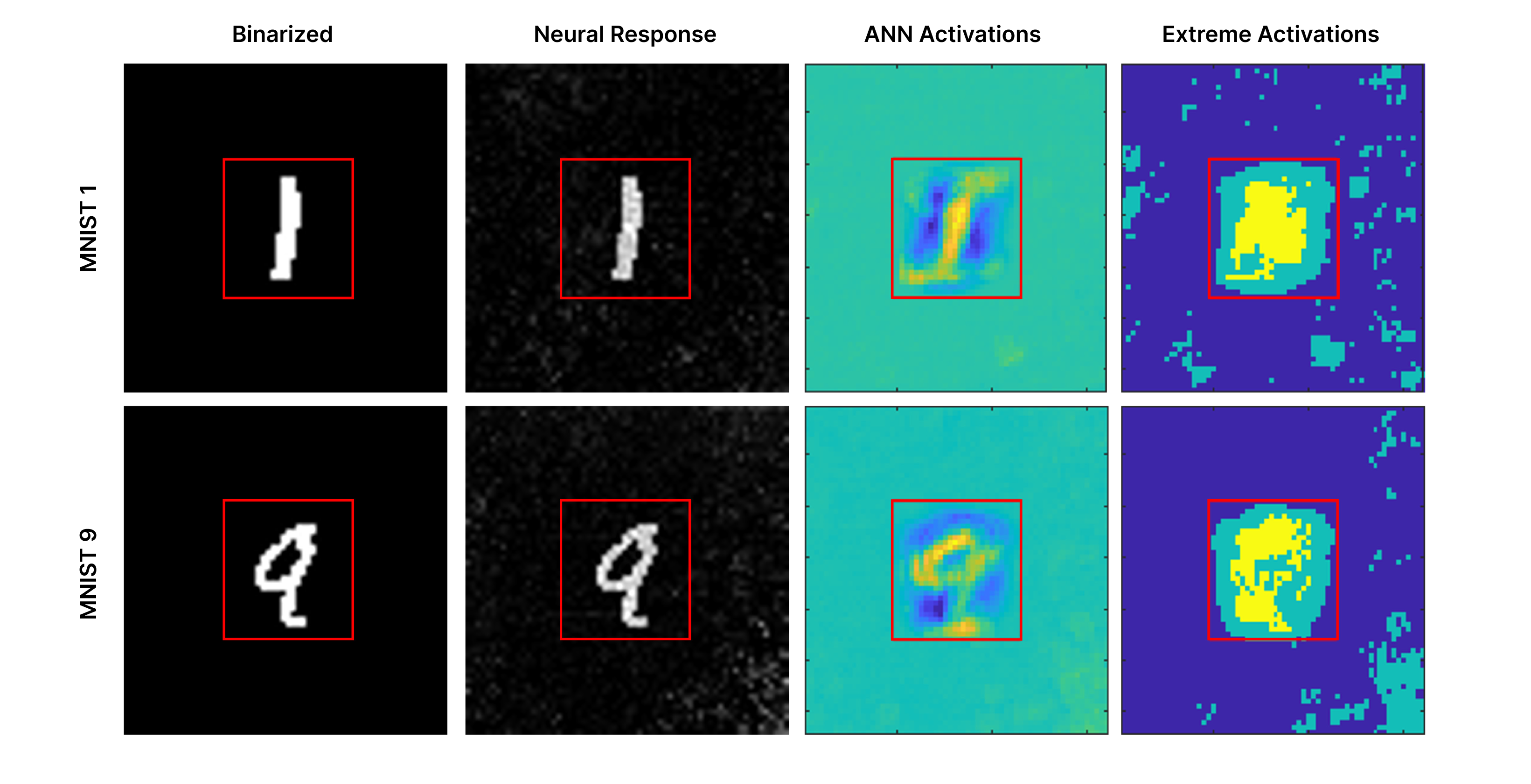 Figure 3. Biological neural dynamics project images into a higher dimensional space leveraged for classification. MNIST digits are binarized and used to stimulate a biological neural network (left), producing neural responses that extend beyond the region of direct stimulation (second column; red box indicates the original 28×28 digit area). When a convolutional neural network is trained on binarized MNIST images alone, the resulting changes in convolutional layer activations are shown in the third column (ANN activations), reflecting features learned from biological inputs. The most extreme activations from that network are shown in the fourth column, with the top 5% of changes highlighted in yellow and the top 20% in aqua. These biologically driven activation patterns reveal consistent, class-specific structure outside the original stimulation region that the classifier leverages to improve performance.