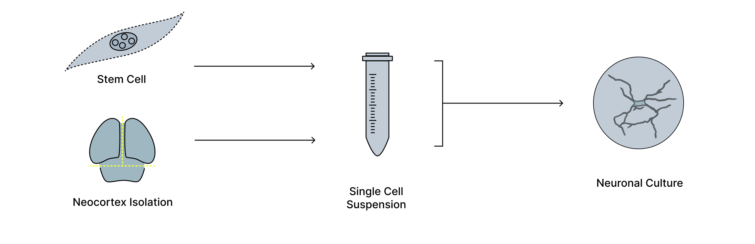 Figure 1. Generation of living neuronal cultures on electrode arrays. Neurons are derived from biological tissue, isolated, and dissociated into a single-cell suspension before being grown on high-density multielectrode arrays. Over time, these cells form living neuronal cultures that can be interfaced with electronic systems, providing a physical substrate for studying and harnessing neural activity.