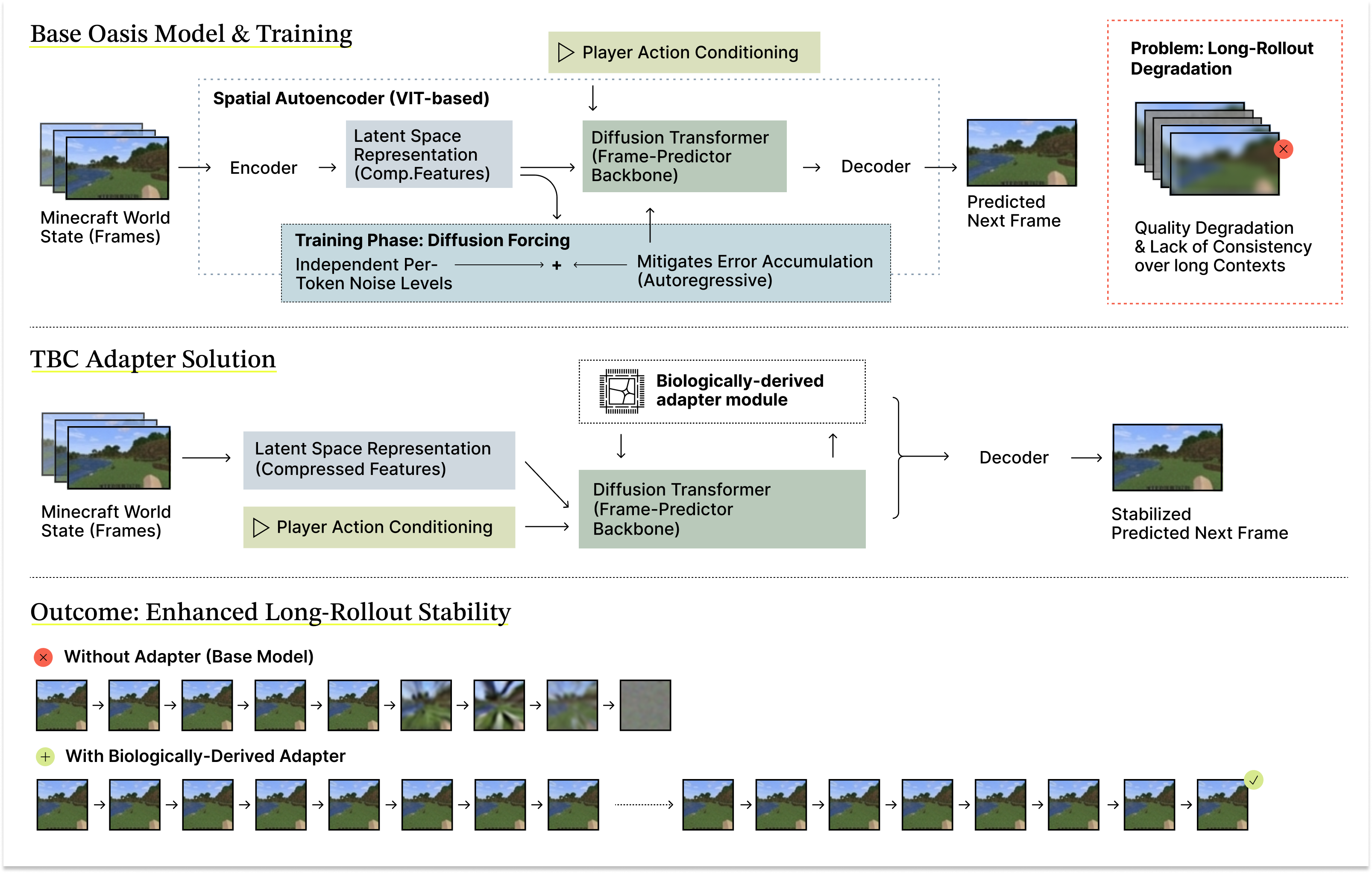 Figure 1. Schematic of the base Oasis video model and the TBC adapter solution. The base Oasis Diffusion Transformer model uses a ViT-based spatial autoencoder, action conditioning, and diffusion forcing to predict future frames, but exhibits quality degradation and loss of coherence during long autoregressive rollouts. Integrating a lightweight, biologically derived adapter into the frame-prediction backbone stabilizes intermediate representations during inference, resulting in more coherent long-horizon rollouts and preserved visual quality with minimal additional parameters.
