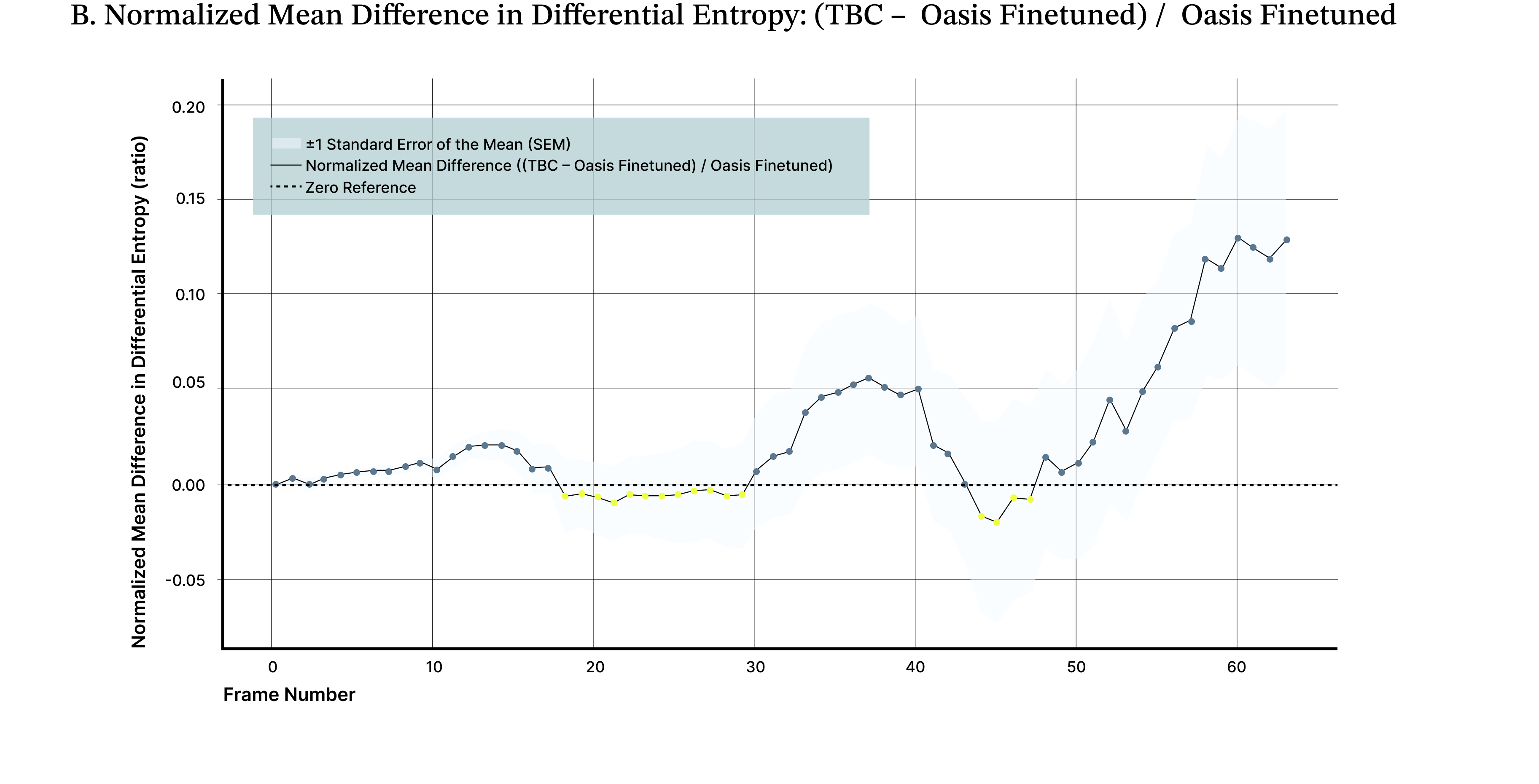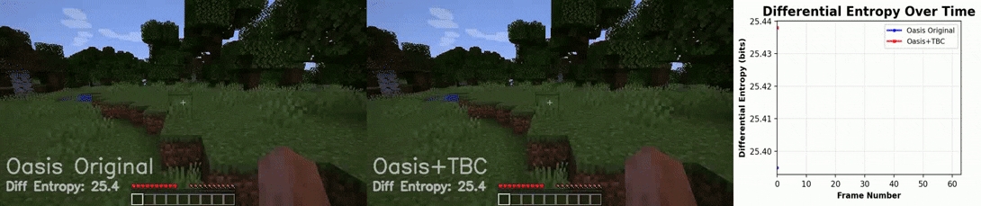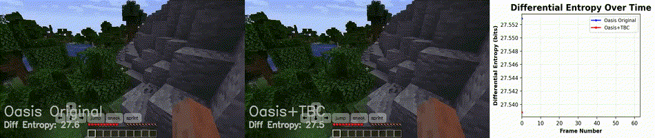 To quantify this effect, we measured differential entropy across generated frames as a proxy for visual information content. Results are reported as the normalized mean difference in differential entropy between the biologically augmented model and the baseline, averaged across 10 independent evaluation videos initialized with different starting scenes and actions. Across these rollouts, the TBC adapter yields an average ~19% improvement in image quality compared to the base Oasis model (Figure 5A), reflected by lower and more stable entropy over time. A parameter-matched fine-tuned control improves over baseline but underperforms the biological adapter by approximately ~15%, isolating the effect to the adapter rather than retraining (Figure 5B). The TBC adapter maintains an average ~5% improvement in normalized differential entropy relative to a LoRA-adapted model, indicating sustained gains in long-horizon stability where autoregressive degradation is most pronounced (Figure 5C).