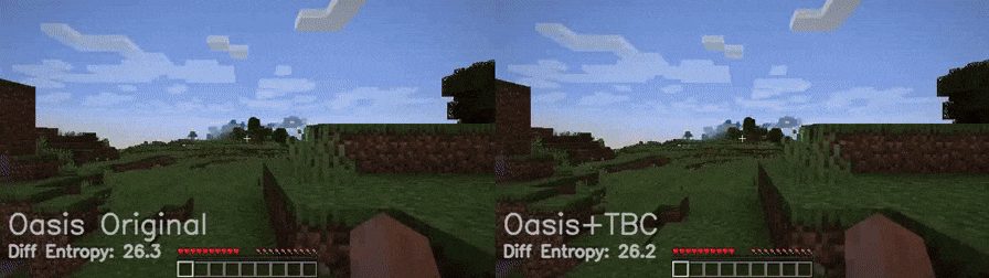 We used the open-source 600M-parameter Oasis Minecraft world generation model, which leverages a Diffusion Transformer (DiT) and player action conditioning to enable interactive gameplay. The DiT operates as the frame-predictor backbone within a latent space defined by a spatial autoencoder based on the Vision Transformer architecture (Figure 1).